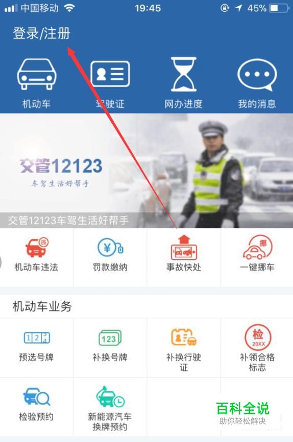 打开交管12123App,进入该软件主页,点击左上方“注册”。