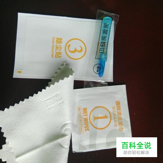 首先我们把买回来的钢化膜拆开,然后检查需要用到的物品够不够。其中我们包括钢化膜、酒精纸、小帕子、白边填充液、除尘贴。