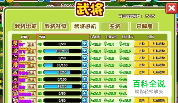 在村长征战团网页游戏里,武将是你南征北战的一支主力军,大家不断地对武将进行培养,你会发现你的战斗力会得到逐渐的提升。大家对武将培养的一个有效途径就是进阶。那村长征战团武将怎么进阶的呢?村长征战团武将进阶消耗什么材料呢?我们一起来看看,村长征战团武将进阶数据表攻略吧。 村长征战团武将除了等级能使用金币升级外,大家还能使用相应的武将碎片,对武将进行进阶。武将进阶操作,需要大家进入到武将系统里,并找到“武将进阶”选项,就能花费武将碎片或者红钻石,对武将进行进阶。 目前,村长征战团武将进阶等级满级为5星,武将进阶能提高武将的生命成长、力量成长、射击成长3种进阶属性。武将进阶等级越高,获得的进阶属性会越好,不同武将其获得的进阶属性不一样。无论武将品质怎么样,武将进阶所消耗的武将碎片数量是相同的。村长征战团武将进阶数据,如下: 0星武将进阶到1星武将:要消耗10个武将碎片; 1星武将进阶到2星武将:要消耗20个武将碎片; 2星武将进阶到3星武将:要消耗50个武将碎片; 3星武将进阶到4星武将:要消耗100个武将碎片; 4星武将进阶到5星武将:要消耗150个武将碎片。 大家对武将进阶,要耗费大量的武将碎片。大家要收集武将碎片的话,就要多留意宝殿系统的刷新情况。因为各个宝殿都会刷新出各种武将碎片。另外,每日折扣商城里也会刷新一些武将碎片,大家也要多留意下。在精彩活动列表当中,还会开放一些优惠活动,获得一些武将碎片的,大家平时也要多留意一下。玩家平时有足够的体力值,也能扫荡一些大城副本,会有几率掉落一些武将碎片的。 一些VIP玩家还能使用使用红钻石,直接对武将进行进阶操作。VIP玩家的VIP等级必须达到10级或以上,才能使用红钻进阶功能。直接用红钻进阶武将的花费,与红钻宝殿里的武将碎片价格一样的。 玩家知道武将碎片的出处后,接下来就是做到合理选择武将碎片,建议大家收集紫色品质以上的武将碎片,因为紫色品质以下的低品质武将,大家迟早都是要淘汰掉,就没必要浪费那么多资源在低品质的武将上啦。