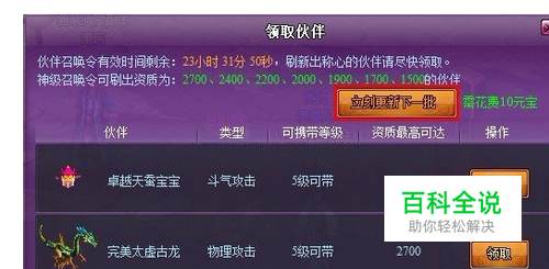 一、斗破苍穹2如何获得伙伴 1. 完成主线任务中的击杀指定怪物都可以获得伙伴召唤符,点击使用即可召唤。 2.商城的限时抢购中有拉风的神级伙伴召唤令出售。 点击使用即可召唤,也可通过刷新来获取更高资质的伙伴,最高资质可以达到27000。
