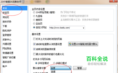 然后在常规选项卡中,点击右侧的默认搜索引擎下拉列表框选择默认的搜索引擎,最后点击确定按钮即可,如图所示: