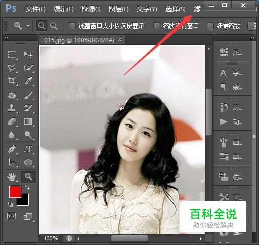 首先,打开PS CS6软件,打开一幅人物图像,点击滤镜菜单。