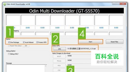 刷入Recovery • 关机状态下按住 音量下键+HOME键+电源键 进入挖煤模式, • 将工具包解压后,运行 Odin(刷机工具).exe • 勾选三个选项,点击 OPS 按钮选择 刷机文件 目录下的 TASS_v1.0.ops • 点击 One Package 按钮选择 刷机文件 目录下的 Recovery.tar 开始刷入 Recovery