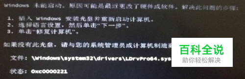 笔记本开机故障,显示为: 文件:\windows\system32\drivers\LDrvPro64.sys 状态:0xc0000221 信息:由于关键系统驱动程序丢失或损坏,因此Windows无法加载. 如下图:
