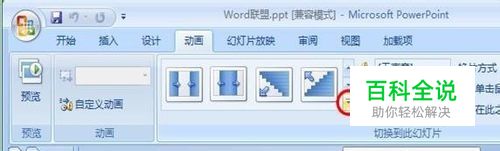 单击菜单上的“动画”选项卡,我们就已经进入了PPT切换效果区域,正是我们想要的!(如下图红色区域)