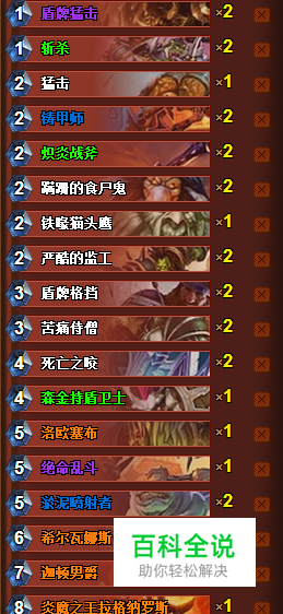 法力值消耗 1: 盾牌猛击 x 2 斩杀 x 2 法力值消耗 2: 猛击 x 1 铸甲师 x 2 炽炎战斧 x 2 蹒跚的食尸鬼 x 2 铁喙猫头鹰 x 1 严酷的监工 x 2 法力值消耗 3: 盾牌格挡 x 2 苦痛侍僧 x 2 法力值消耗 4: 死亡之咬 x 2 森金持盾卫士 x 1 法力值消耗 5: 洛欧塞布 x 1 绝命乱斗 x 1 淤泥喷射者 x 2 法力值消耗 6: 希尔瓦娜斯·风行者 x 1 法力值消耗 7: 迦顿男爵 x 1 法力值消耗 8: 炎魔之王拉格纳罗斯 x 1 格罗玛什·地狱咆哮 x 1 法力值消耗 9: 阿莱克丝塔萨 x 1