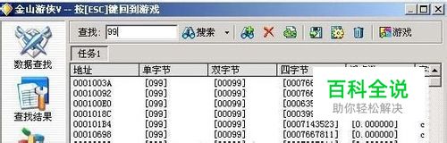 第三步: 对照游戏中界面,在查找框输入要修改的数值,按回车键。此时游侠就开始查找所改数值的内存地址。