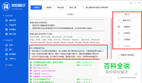 打开爱思助手后,将手机连接上电脑。 点击左侧最底部的“爱思工具箱” 看到右侧的操作栏。一项一项点就可以了。 我们先点击第一项【查找SHSH】 观察中间红框里的字,按照提示进入DFU模式。 基本就是,先按home键,再按开机键,都不要松开。等屏幕关闭后4秒左右,松开开机键,但home键不要松开。然后等软件提示成功就可以了。