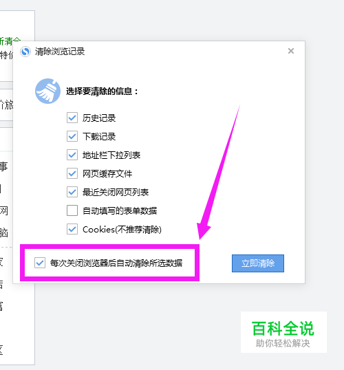 在打开的弹窗中,我们勾选我们需要清理的选项,然后勾选下方的”每次关闭浏览器后自动清除所有数据“,如下图所示。
