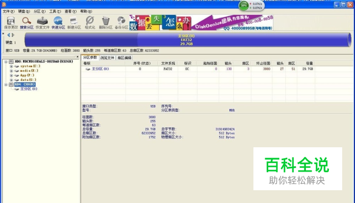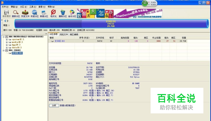 (5)反复几次,可能出现读扇区错误。注意中间换其他卡(比如4G卡)时要重新拔插USB线,而不是SD卡!终于可以在DiskGenius中看到出现"RD4:(30GB)"字样的盘符;并且查看主分区可以看到原来的完整的FAT32文件系统;