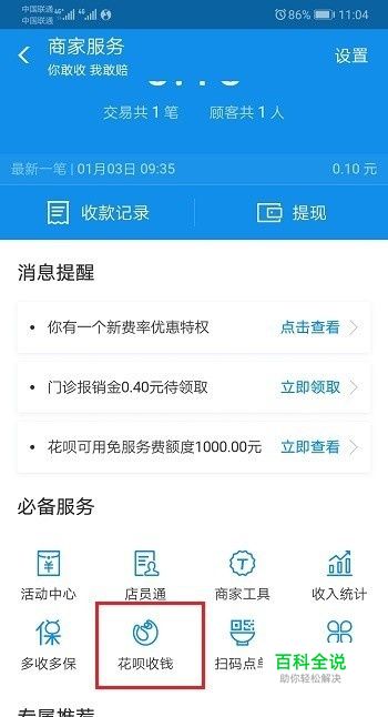 第二步进去商家服务之后,点击花呗收钱,如下图所示: