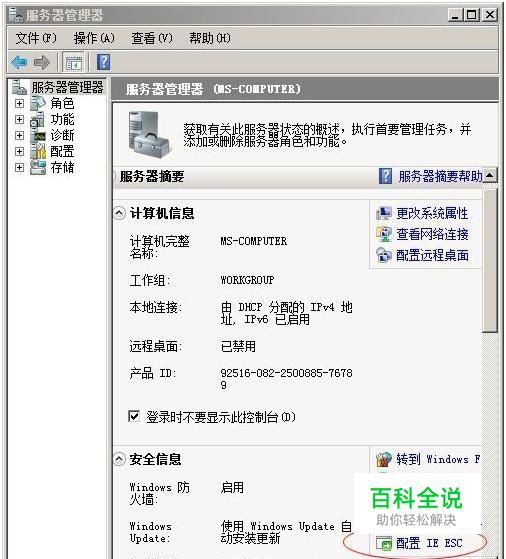 点击“开始”=>“管理工具”=>“服务器管理器”=>选中服务管理器的左侧树视图的根节点,点击“服务器摘要”下的“配置IE ESC”,弹出“增强的安全配置”对话框,将管理员和用户的默认 “启用” 选项改为 “禁用” 即可。