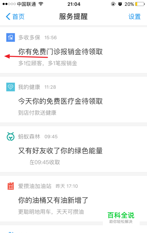 在服务提醒界面,点击右上角的设置按钮