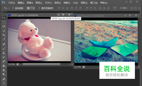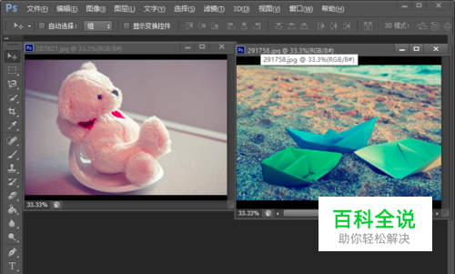 在左侧工具栏中选择“移动工具”,把第二张图片拖到第一张图片的空白处,就完成了两张照片的拼接,最后进行保存即可。
