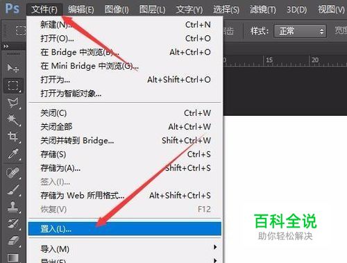 首先,打开PS CS6软件,再点击文件菜单,在弹出的命令中选择置入。