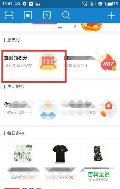打开支付宝首页,页面往下拉,在惠生活中点击“签到领积分”,如下图所示: