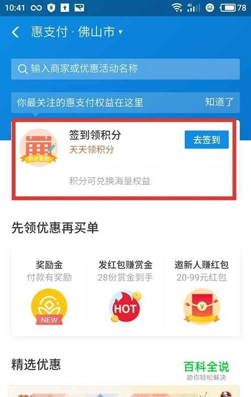 进入惠支付页面,会看到签到领积分,点击“去签到”,如下图所示: