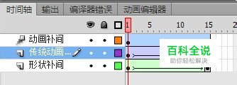 这是一个不得不讲的问题,不搞清楚的话,可能很多朋友不知道传统补间是怎么来的。其实学习过早期版本的特别是Flash8以前版本朋友都知道。在Flash8以前的版本里面是没有传统补间这一说的,为什么呢,因为它们就是传统,那时候的补间只有两种形式。 1、创建补间动画(其实应该说是运动补间动画吧,包括缩放、旋转、位置、透明变化等) 2、创建补间形状(主要用于变形动画,如圆的变成方的,这个字变成那个字等) 他们在时间轴上的表现形式也不一样,如图: