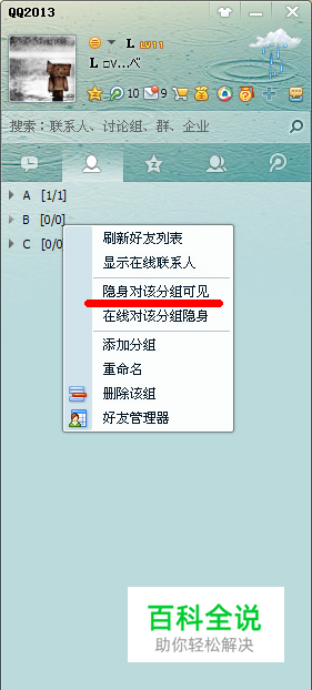 把分组B设为隐身对其可见;分组C设置在线对其隐身。