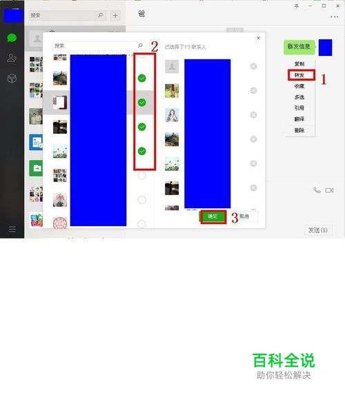 第三种方法通过 转发功能进行群发:选择一个已经发送的微信信息——右击——点击转发——勾选多个好友——然后点击确定就可以群发了,这样就不需要建群了。