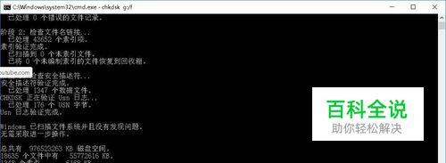打开CMD命令窗口,方法 win+R 打开运行,输入CMD回车即可,或者找到所有程序运行CMD。 在窗口中输入 chkdsk g:/f (其中g就是刚才要记住的移动硬盘盘符号) 然后回车就会自动运行了,各种执行,很快的。