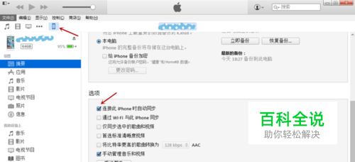 方法一,在设备的界面取消选中“连接此iPhone时自动同步”选项;