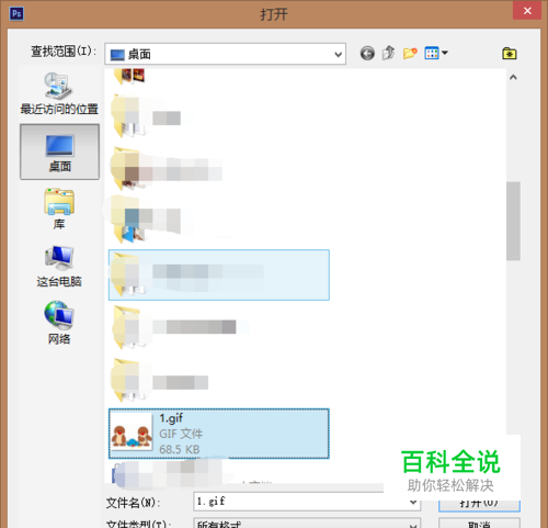 打开ps 然后选择我们要处理的gif图片,双击ps空白区就会跳出打开的提示窗口了,或者 菜单栏选择 文件->打开。