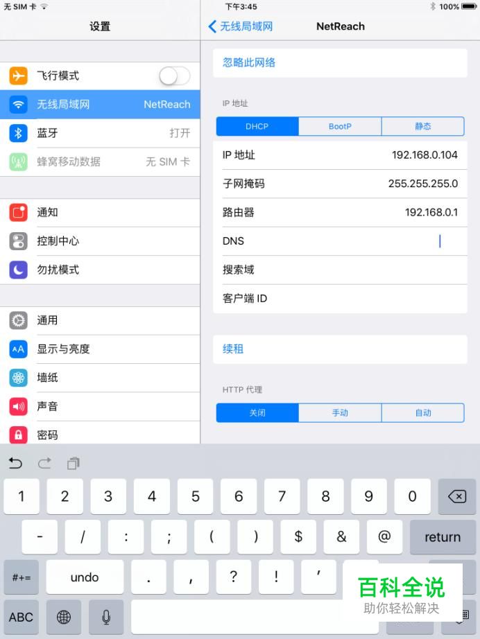 如图所示,唤出数字输入法键盘。更改DNS服务器地址为"114.114.114.114",点击"无线局域网"向左箭头返回。