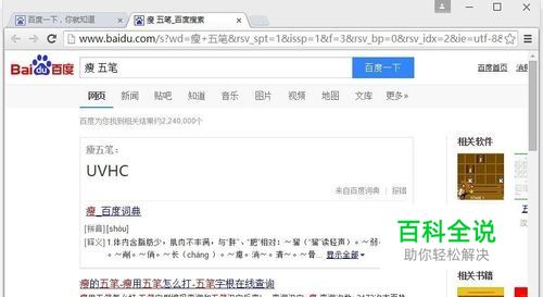 这时在百度搜索结果里会出现 瘦五笔: UVHC 来自百度词典 这样的结果,这个UVHC就“瘦”字的拆字字根了