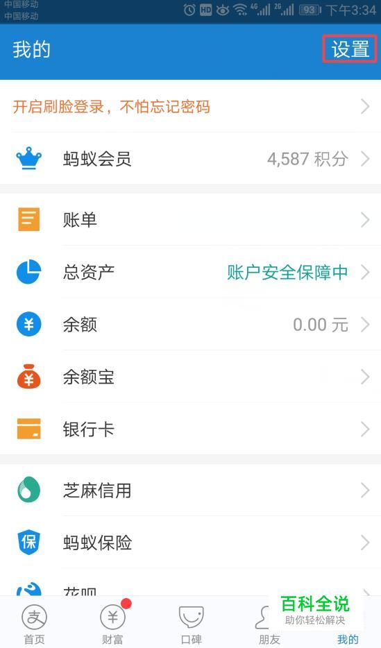 首先,我们打开我们的支付宝,然后我们点击右上角的设置;