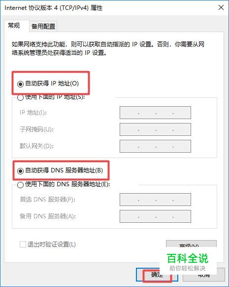 然后我们将IP地址和DNS地址全部设置成自动获取的形式,出现黄色感叹号就是由于我们没有设置成自动获取的形式导致的,我们最后点击确定就可以了。