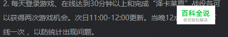 落英经常会出一些游戏内的活动,比如完成什么战役就获得什么奖励,比如下图的完成“泽卡莱恩”战役,洛英官方检测是否完成战役的标准是只要你开始了战役就可以了,并不一定要完成,其实“完成、”是他们玩的文字游戏而已。也许本来只要达到80级可以进行“泽卡莱恩”战役就可以获得俩次机会的,但是写的却是完成战役可以获得俩次机会。还有三天每天在线多少分钟才可以领什么奖,实际上只要一天在线那么久的话就可以领奖了。不知道是不是程序漏洞呢?