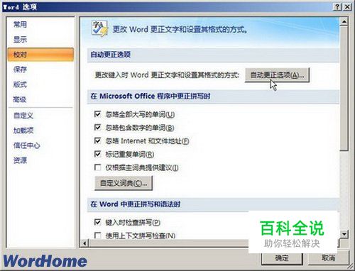第2步,在打开的“Word选项”对话框中切换到“校对”选项卡,并在“自动更正选项”区域单击“自动更正选项”按钮。