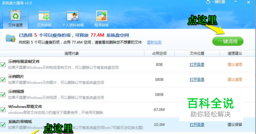 2.清理完毕后,看软件右面,点击系统瘦身。进入系统瘦身界面,上面有4个选项,常用的有文件清理、程序转移。先进行文件清理,全选,然后一键清理。