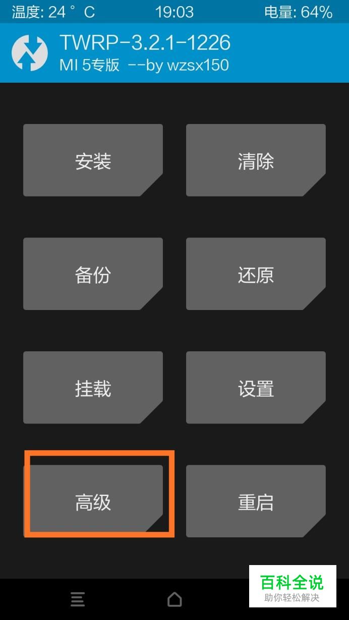 长按电源键和音量加键进入rec模式,选择“高级”。