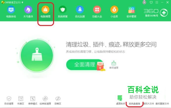 首先,需要说明一下,虽然电脑也自带有磁盘清理功能,但效果不明显。所以我主要通过两款常用软件来解决这个问题。先安装360安全卫士,打开安全卫士界面,点击“电脑清理”,可以看到右下角有一个“系统盘瘦身”按钮。