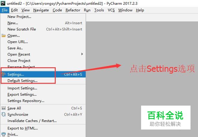 打开Pycharm软件,点击左上角的File菜单,在下拉界面中选择Settings选项,如下图所示