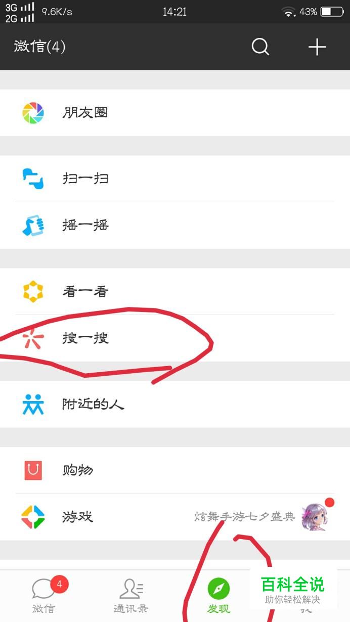 首先,大家在桌面上找到“微信”并打开,并登录好自己的账号,点击到“发现”的页面,再点击“搜一搜”
