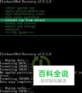3、双清完了之后,在recovery模式主界面选择install zip from sdcard, ps:按音量上下键移位,HOME键确认,关键键返回。(recovery版本不同选择键有所差异,具体根据自己的操作)。