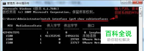 在打开的窗口中,输入“netsh interface ipv4 show subinterfaces”命令,这是用来查询到目前系统的MTU值;