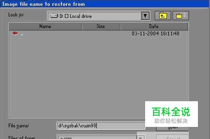 出现“镜像文件还原位置窗口”,如图所示,在File name处输入镜像文件的完整路径及文件名(你也可以用光标方向键配合Tab键分别选择镜像文件所在路径、输入文件名,但比较麻烦),如d:\sysbak\cwin98.gho,再回车。