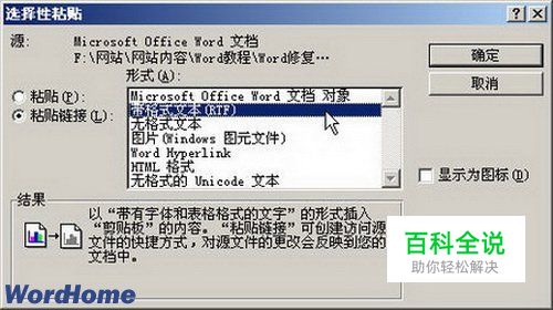第1步,新建一个Word2003文档(简称文档1),输入并选中任意多个字符,然后执行复制命令。再次新建一个Word文档(简称文档2),在文档2菜单栏依次单击“编辑”→“选择性粘贴”菜单命令,打开“选择性粘贴”对话框。选中“粘贴链接”单选框,并在“形式”列表中选中“带格式文本(RTF)”选项。完成设置后单击“确定”按钮。