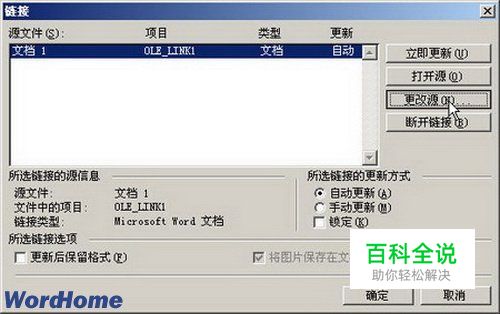 第2步,在Word文档2窗口菜单栏依次单击“编辑”→“链接”菜单命令,打开“链接”对话框。在“源文件”列表中选中文档1,并单击“更改源”按钮。