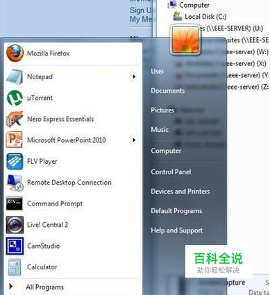 随着Windows 7的屏幕加载到桌面上,你会看到一个底部的蓝色酒吧和一个空白的屏幕通常是蓝色的,这是在桌面,通常有一个回收站图标。 从屏幕左侧点击“开始”菜单“按钮,将弹出,并产生一个垂直的菜单左图。 在用户名以上的菜单的顶部,你会看到一个小图片。用鼠标点击这个小图片。