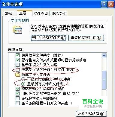 我的是XP系统。有人说是安装风行产生的插件导致。但是我最近没有安装风行,以前安装过,最近才出现的这个问题。 首先,显示所有隐藏文件和文件夹。打开我的电脑\工具\文件夹选项 点开查看页,按照图示设置。