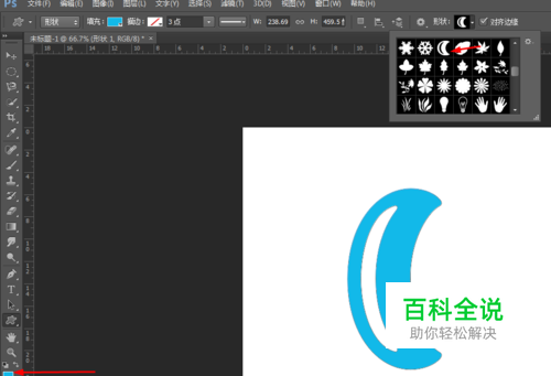 在ps软件中,新建一个800*800的文档,背景色为白色,再新建一个图层,然后在选择自定义形状工具,前景色为蓝色,画一个月亮的形状,如图所示