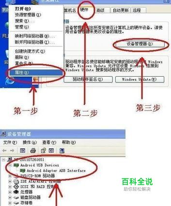 二.确认电脑上已安装手机驱动程序: 查看方式: 手机接入电脑, 然后 鼠标右键 点 我的电脑 - 属性 - 硬件 , 选设备管理器, 查看有没有 Android adapter ADB Interface 驱动,如图: 如果没有驱动,可以将手机接入电脑的时候, 在我的电脑上会出现一个新的虚拟光驱, 上面显示蓝色的"中国电信" 图标, 打开运行里面的 Loader.exe 进行驱动的安装 就可以了,然后再接入手机,确认驱动已装好。
