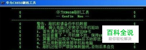 4.再次确认手机停留在华为小花画面上不动, 然后接入数据线 5.按任意键继续........ 6.几秒后,就刷新成功了,手机会自动关机或重启手机。(如果不会自动关的话,就自己关吧,但要确认屏幕上已显示刷机完成)