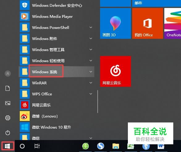 首先,我们点击电脑桌面左下角的微软按钮,弹出的界面,我们点击windows系统;