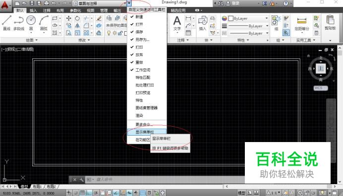 启动AutoCAD 2014辅助设计软件,如图所示。点击自定义快速访问工具栏向下箭头。弹出下拉列表选择"显示菜单栏"项。